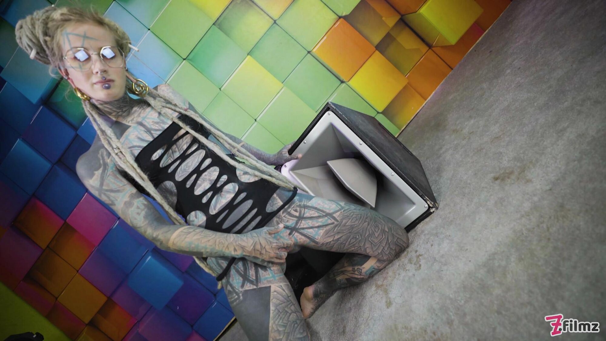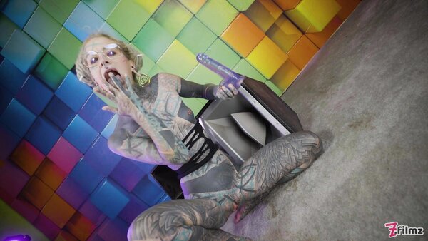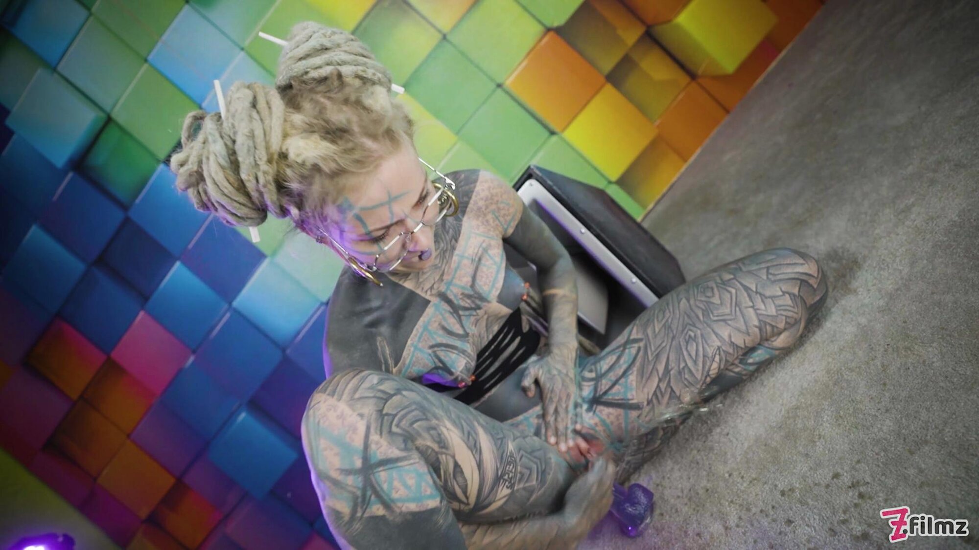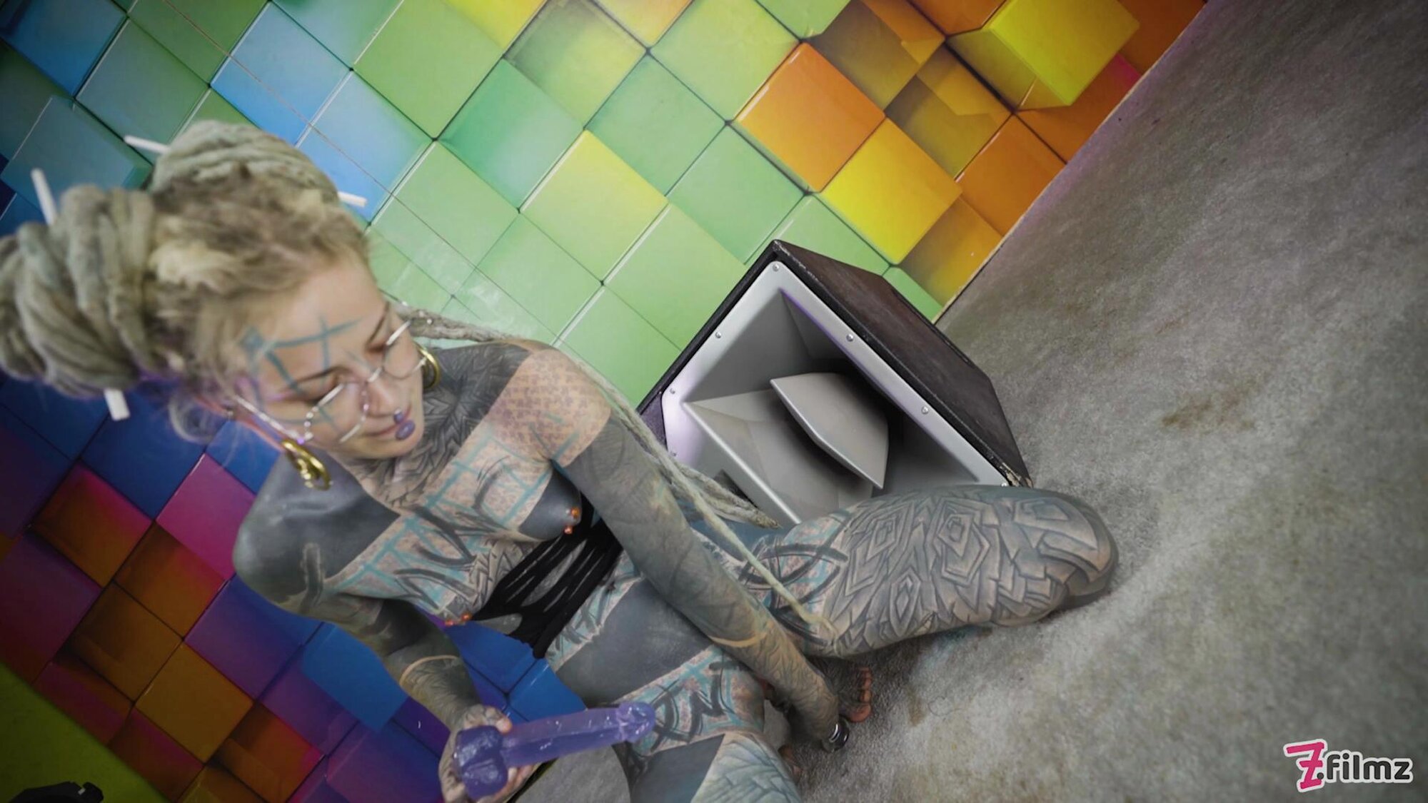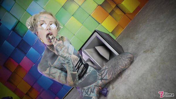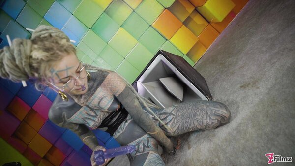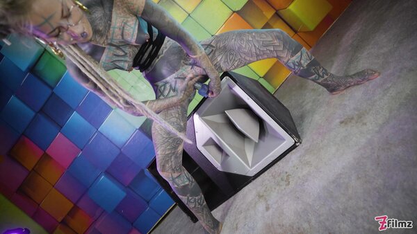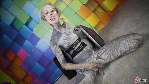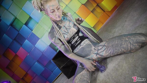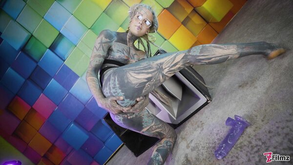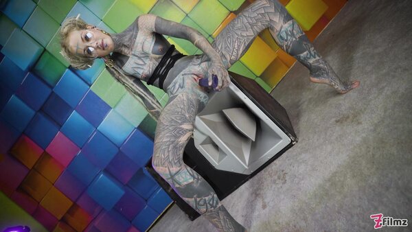 A tattooed goddess struts her stuff in a vibrant, colorful room, her inked body a canvas of art that demands attention. He's a vision in silver, his movements fluid and enticing. She leans back, arching her body, as he approaches, his hands roaming over her tattoos. He teases her with a dildo, her moans filling the air as he slides it into her, her body responding with eager thrusts. She's a vision of raw, unfiltered desire, her tattoos glistening with sweat as she rides the wave of pleasure. The room is electric, the mood intense and charged, a perfect blend of tech and tie, ink and desire. Her moans crescendo as she reaches her peak, her body shaking with her orgasm. It's a scene of pure, unadulterated lust, a feast for the senses that will leave you craving more.